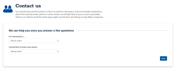 We’ll show you some helpful guidance first - this might answer your question straight away. If not, click Next to continue. Complete the actions on this page and click ‘Submit’.